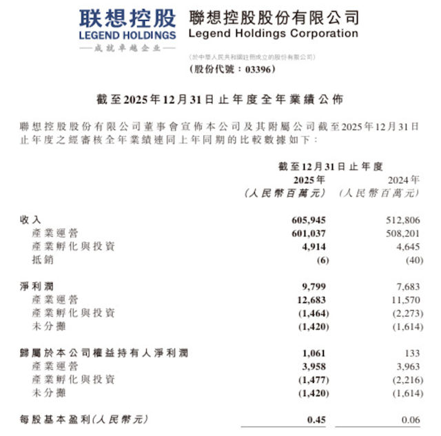根据官方公告数据,联想控股全年总收入达到6059.45亿元人民币,同比增长18%。与此同时,归属于公司权益持有人的净利润达到97.99亿元,同比增长28%,实现了收入与利润的双重高增长。
